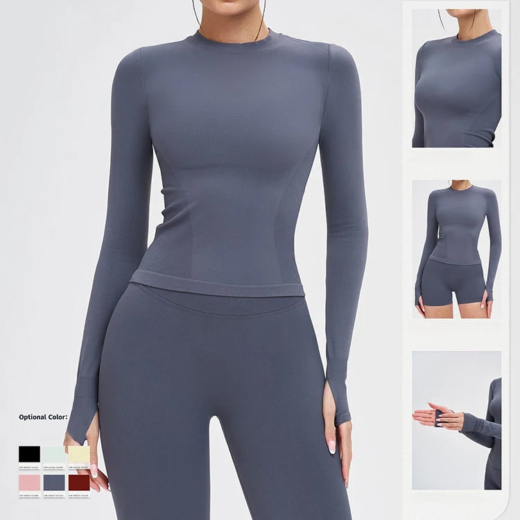 Seamless Crop Yoga Top Crew Neck Thumb Hole Long Sleeve High Elastic Gym Workout Running Outdoor Sports Wear for Women